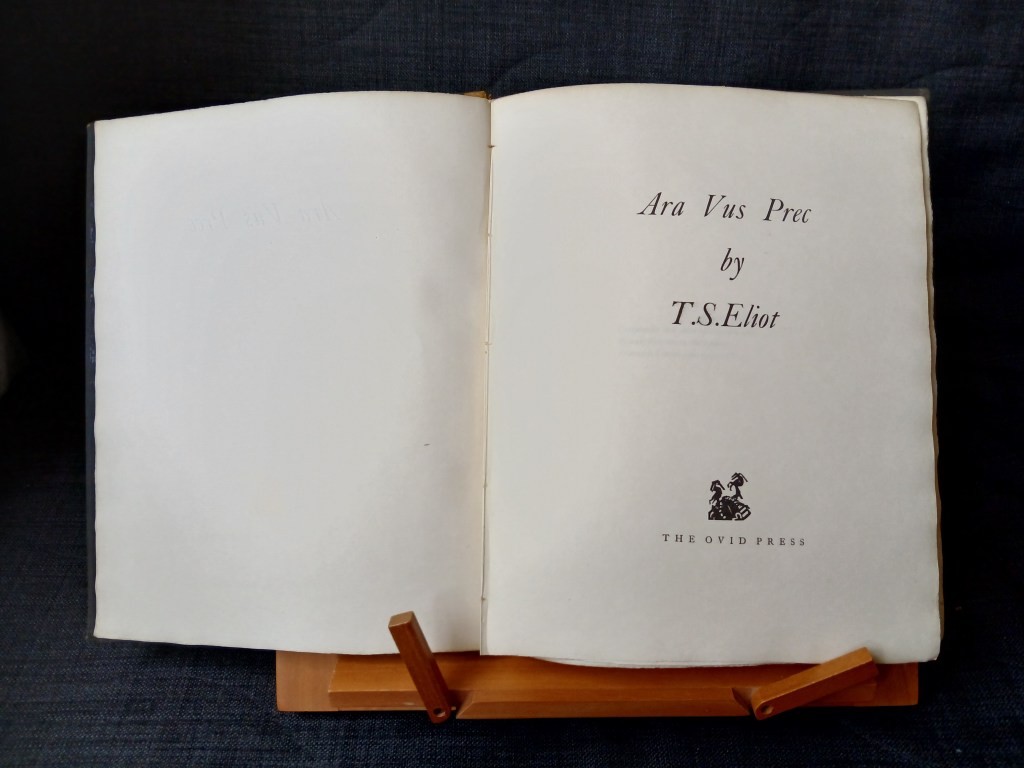 Combining poems Previously published in Prufrock and Other Observations (Egoist, 1917) and Poems (Hogarth Press, 1919) with some new work, Ara Vos Prec was T. S. Eliot’s Third Poetry Collection.