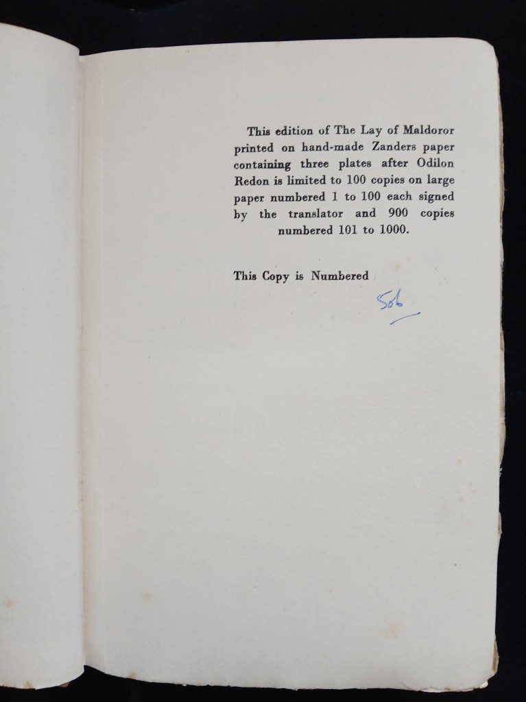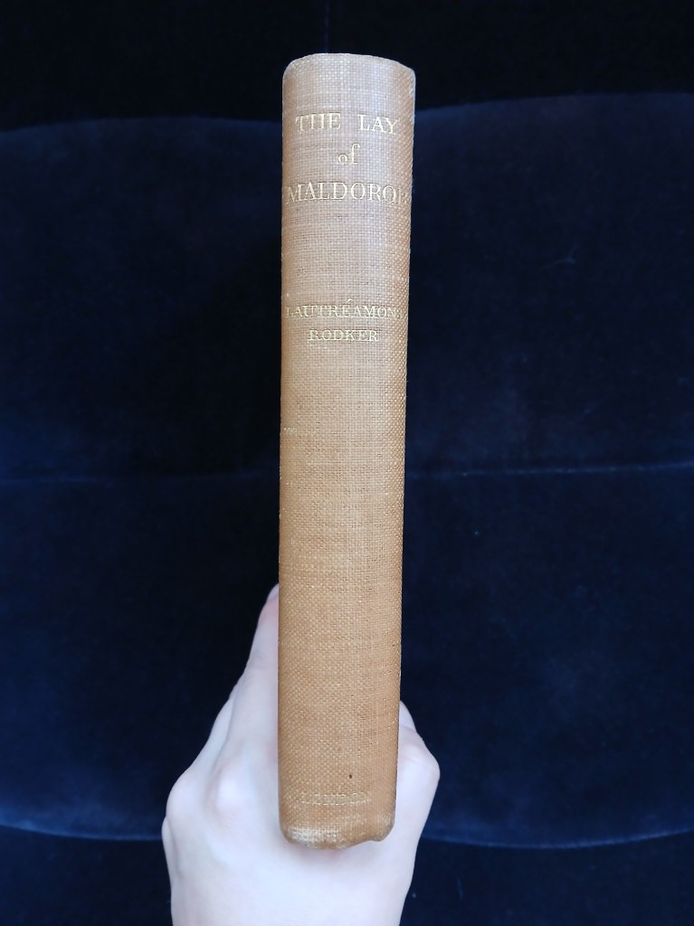 The Copy of Maldoror in my collection encourages me in this assumption. Its orange cloth binding appears to be original, however, it differs from the dark blue cardboard and quarter leather bindings found in other copies I have seen of this book, for instance at the British library and the Bodleian.